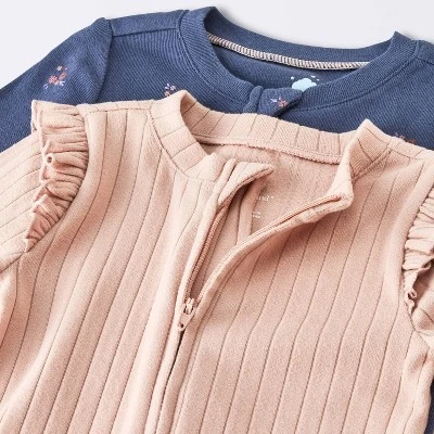 Keep your little one cozy and cute by dressing them in the pieces from the 2-Pack of Cozy Wide Ribbed Floral Sleep N’ Play from Cloud Island™. This pack of two sleep n’ plays includes one in solid color with a wide ribbed pattern and ruffles along the shoulders, and one with floral print for a sweet look every day. Made from recycled polyester fabric with added spandex, these pieces offer soft and stretchy comfort, and their long sleeves and footed ends provide full coverage. Designed with fold-over mitten cuffs, the sleep n’ plays also have front full-length zipper closures for easy dressing and diaper changes. Best of all, the snap tabs help prevent their chin from scratches.